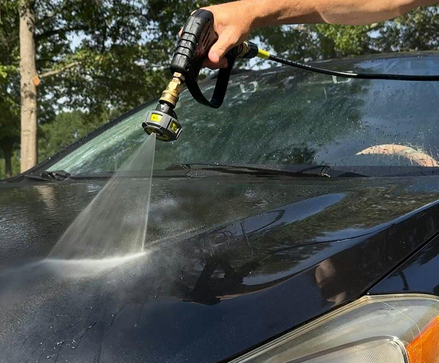 - 5-in-1 Quick Adjustable Nozzle – Switch effortlessly between 15°, 25°, 40° spray patterns and long/short soap nozzles with a single-hand rotation, eliminating the hassle of swapping nozzles. Max pressure: 3300 PSI, 2.5 GPM, compatible with most pressure washers.